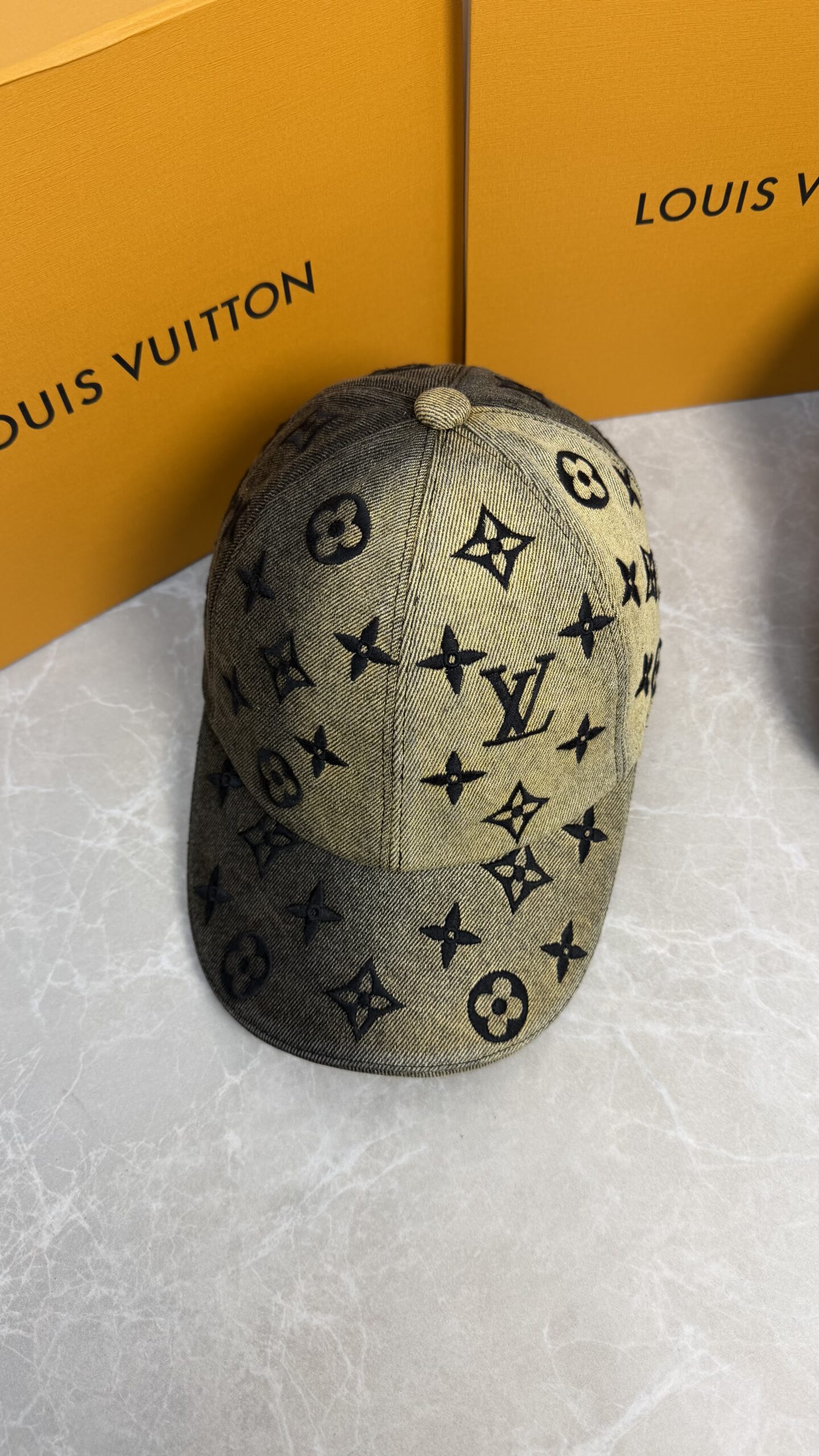 Casquette Louis Vuitton Monogram au dégradé beige/noir, alliant élégance et modernité. La toile emblématique LV et la lanière réglable apportent style et confort à toutes vos tenues.